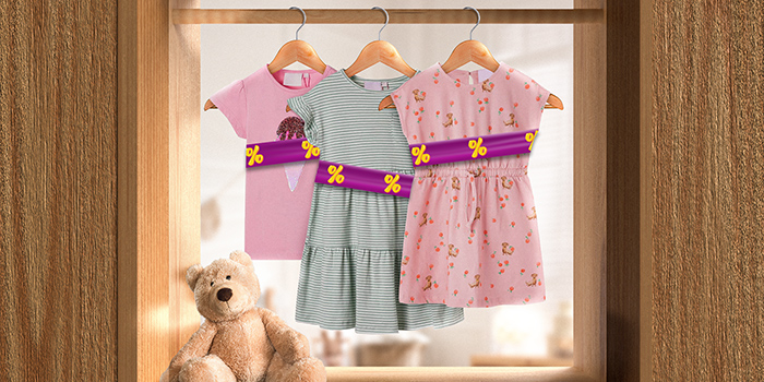 Kinderkleidung auf Kleiderbügeln, mit einem lila Werbeband mit gelben Discount-Symbolen umwickelt, hängt an einer Stange in einem Raum. Klick drauf, um die Produkte im Angebot zu sehen.
